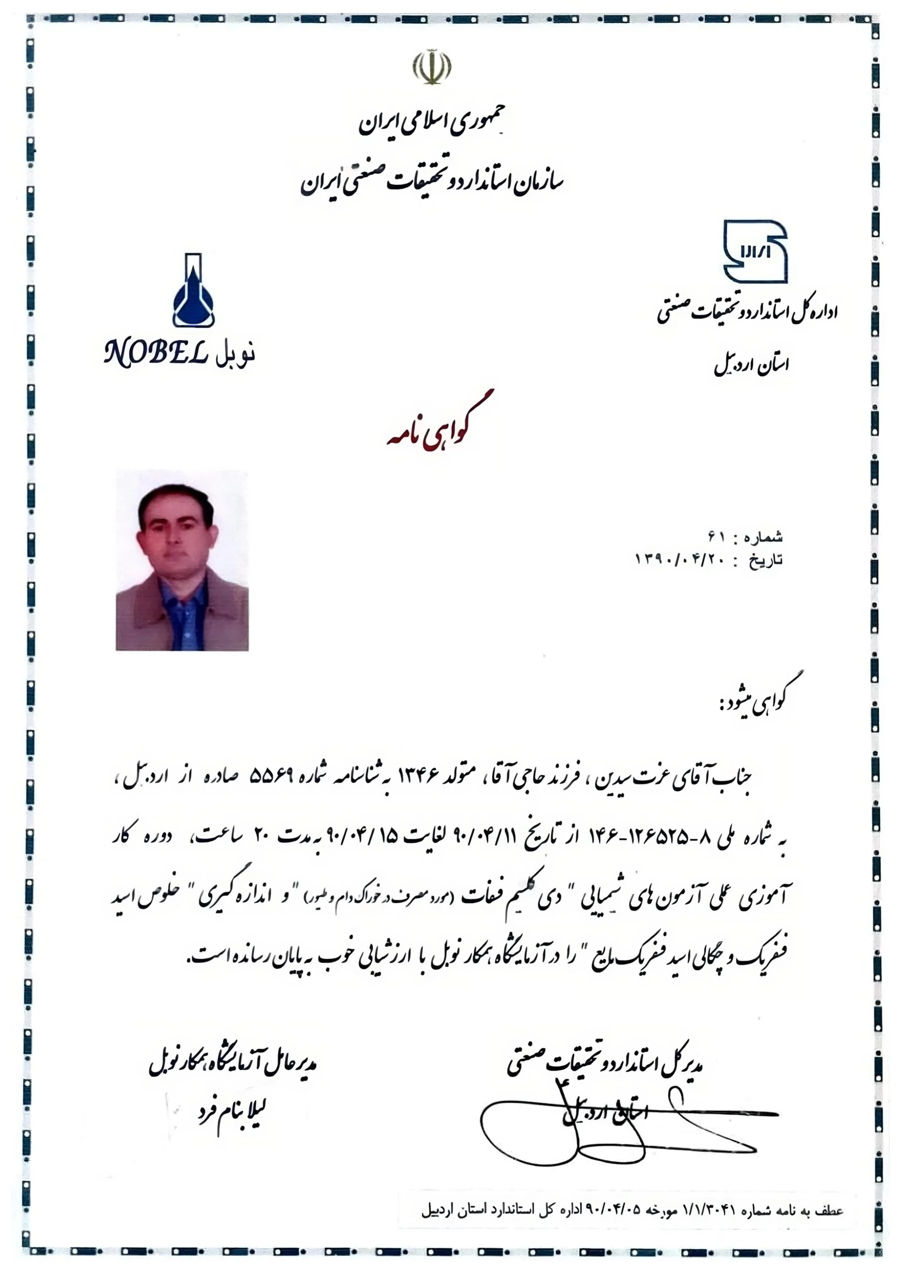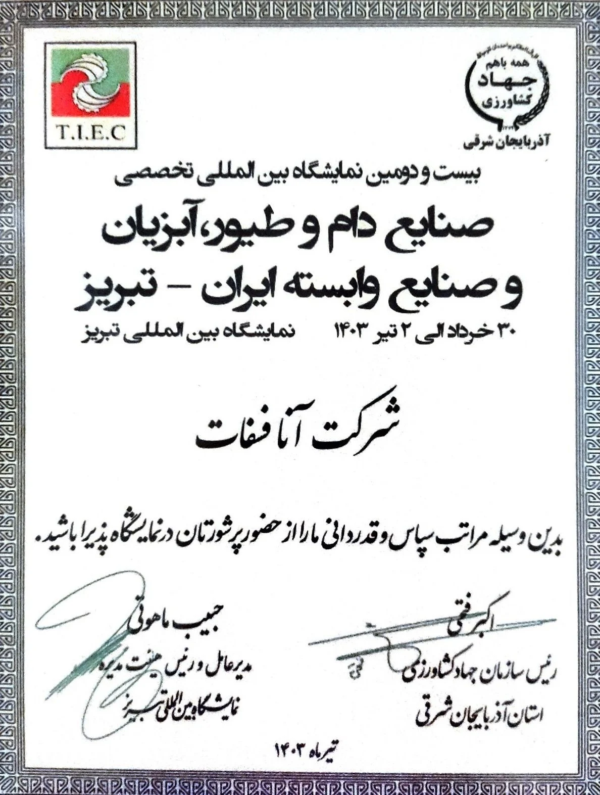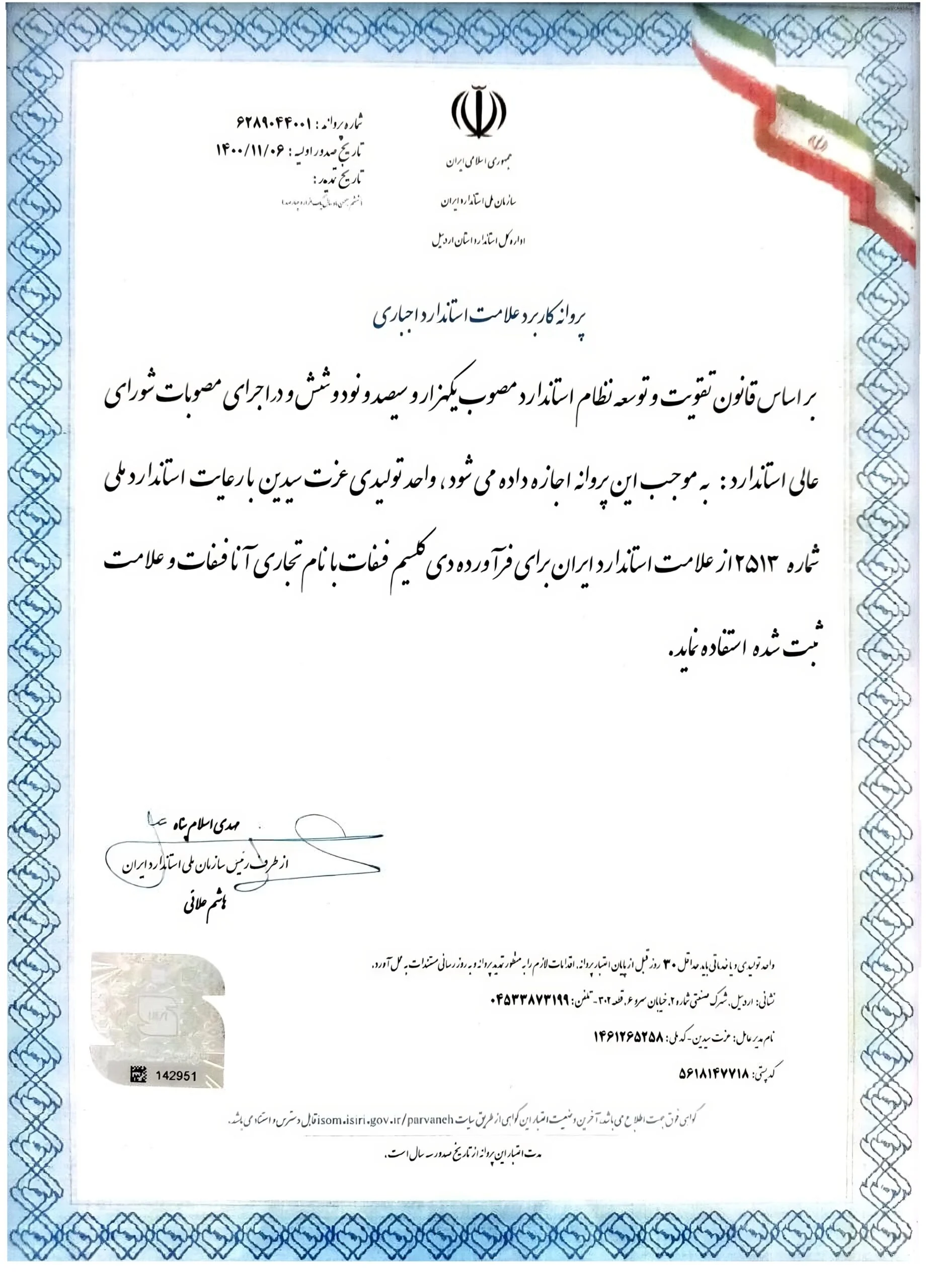 این شرکت دارای گواهی استاندارد و پروانه بهرهبرداری از سازمان دامپزشکی کشور است که نشاندهنده انطباق کامل با معیارهای قانونی و بهداشتی است. همچنین، فرآیندهای تولیدی این شرکت تحت نظارت کامل واحد کنترل کیفیت انجام میشوند تا محصولی با خلوص و کیفیت بالا به بازار عرضه شود.