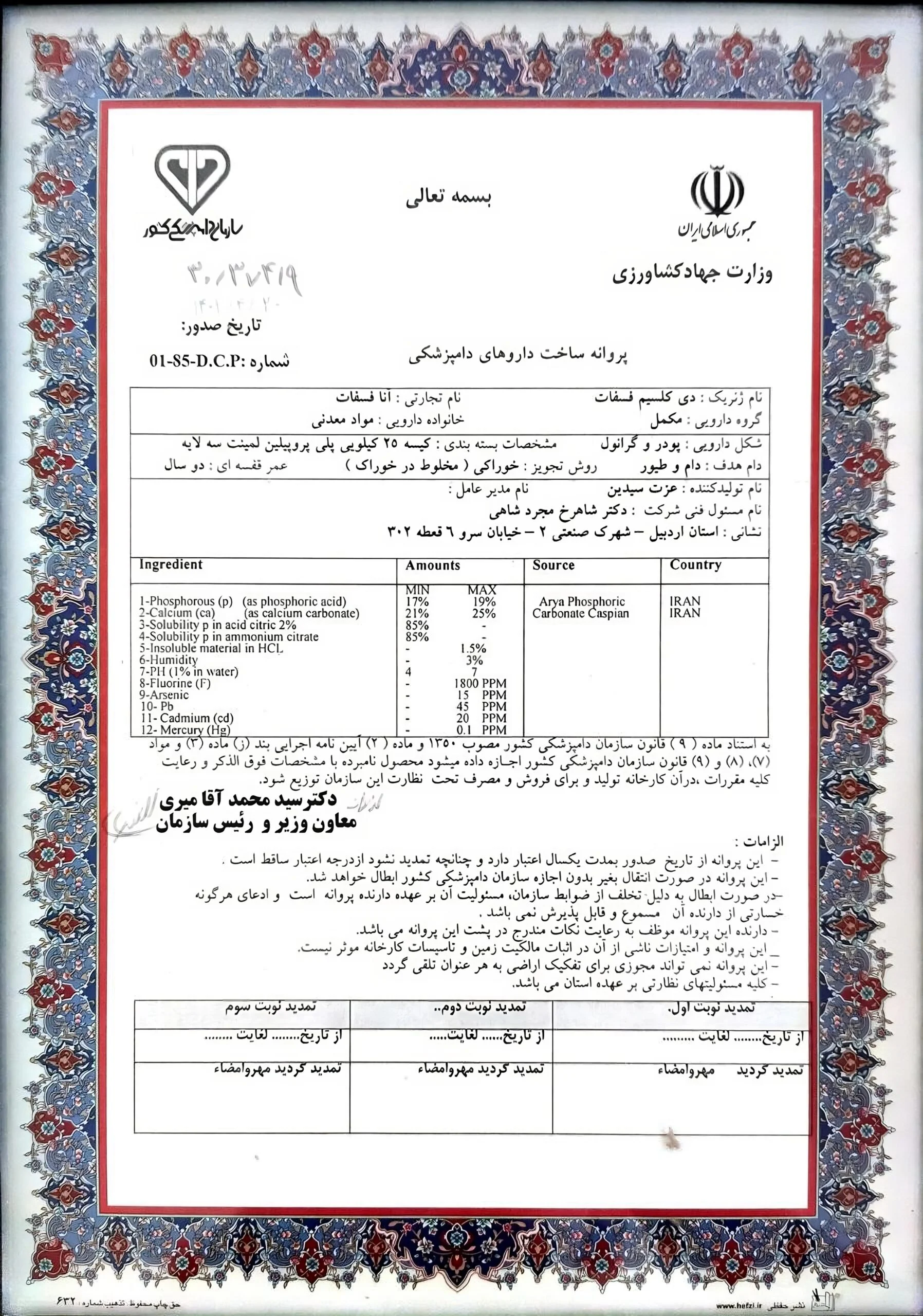 محصول اصلی شرکت دی کلسیم فسفات، یک ماده معدنی حیاتی است که به عنوان یک مکمل ضروری در صنعت خوراک دام و طیور استفاده میشود. کیفیت بالای این محصول تضمینکننده رشد سالم و بهینه دام و طیور است.