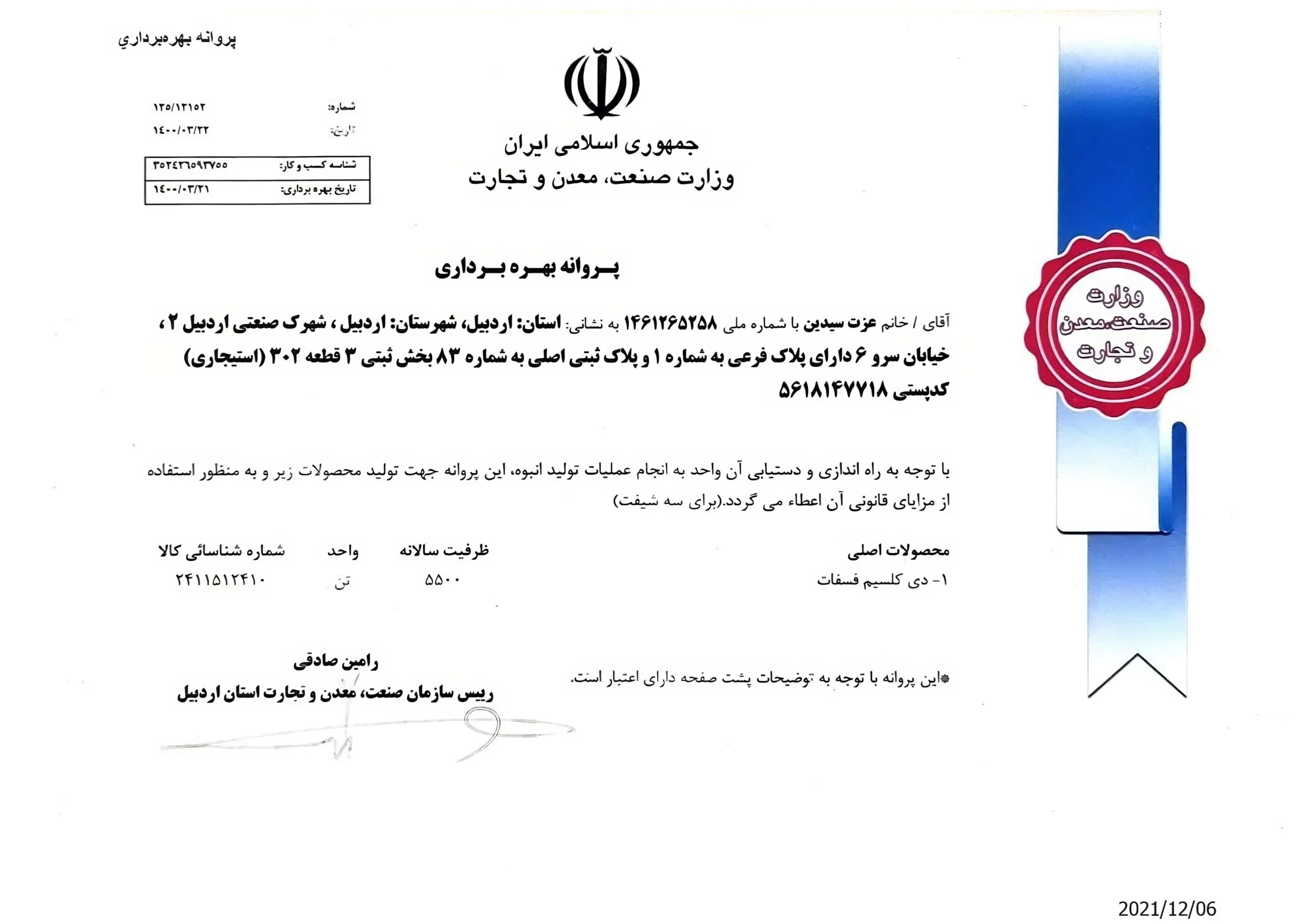 این شرکت در بهار سال ۱۴۰۰ فعالیت خود را در منطقه شهرک صنعتی ۲ شهرستان اردبیل آغاز کرده و از همان ابتدا تمرکز خود را بر روی تولید محصولات با کیفیت بالا قرار داده است. ظرفیت تولید این واحد صنعتی بالغ بر ۳ تن در ساعت میباشد که نشاندهنده پتانسیل بالای تولیدی و تأمین نیازهای منطقه شمالغرب کشور است.